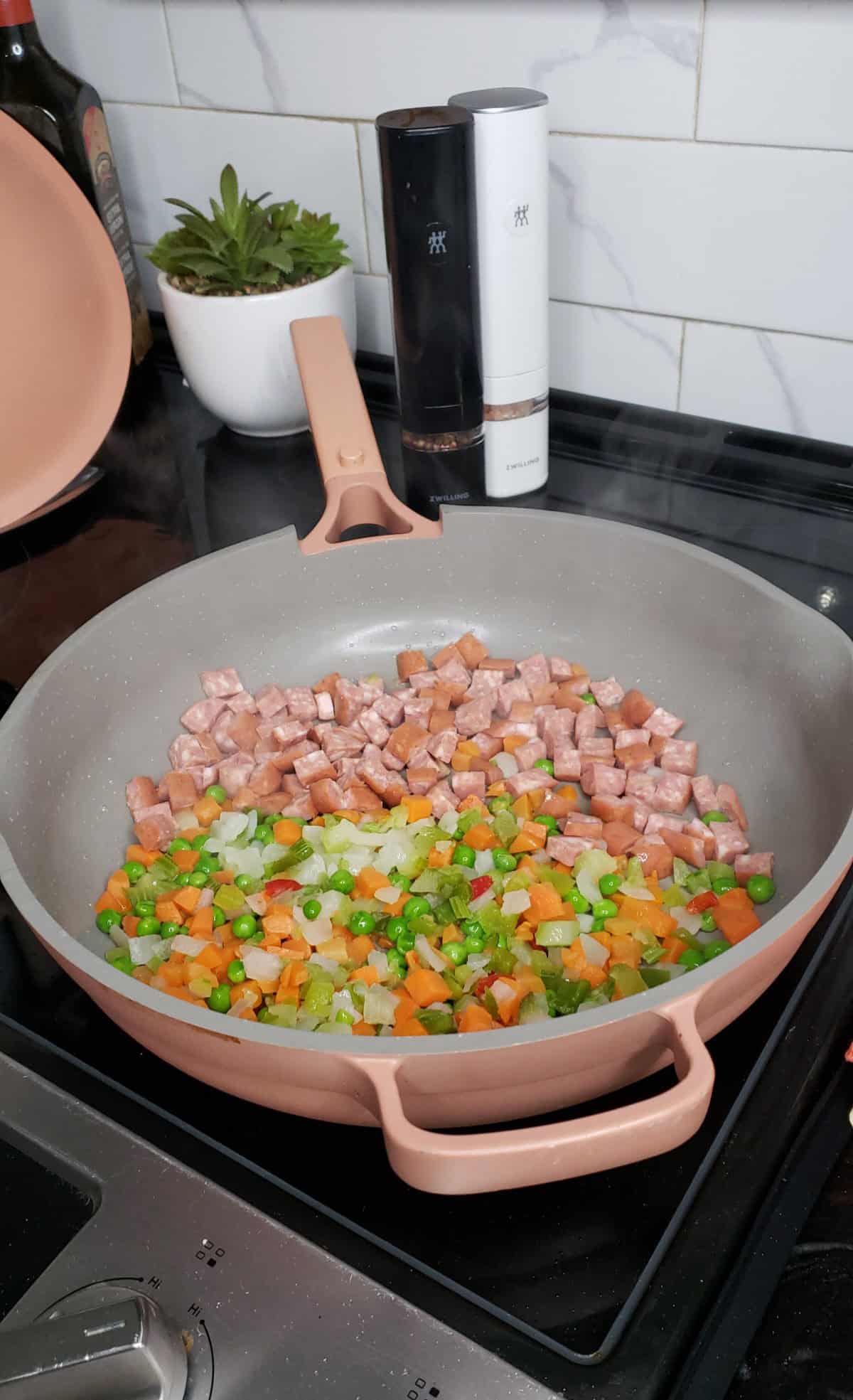 - Add one tablespoon of oil and sauté the frozen vegetables and sausage for 5-7 minutes, stirring occasionally, until heated through and slightly browned. Shift them to one side of the skillet and scramble the eggs.