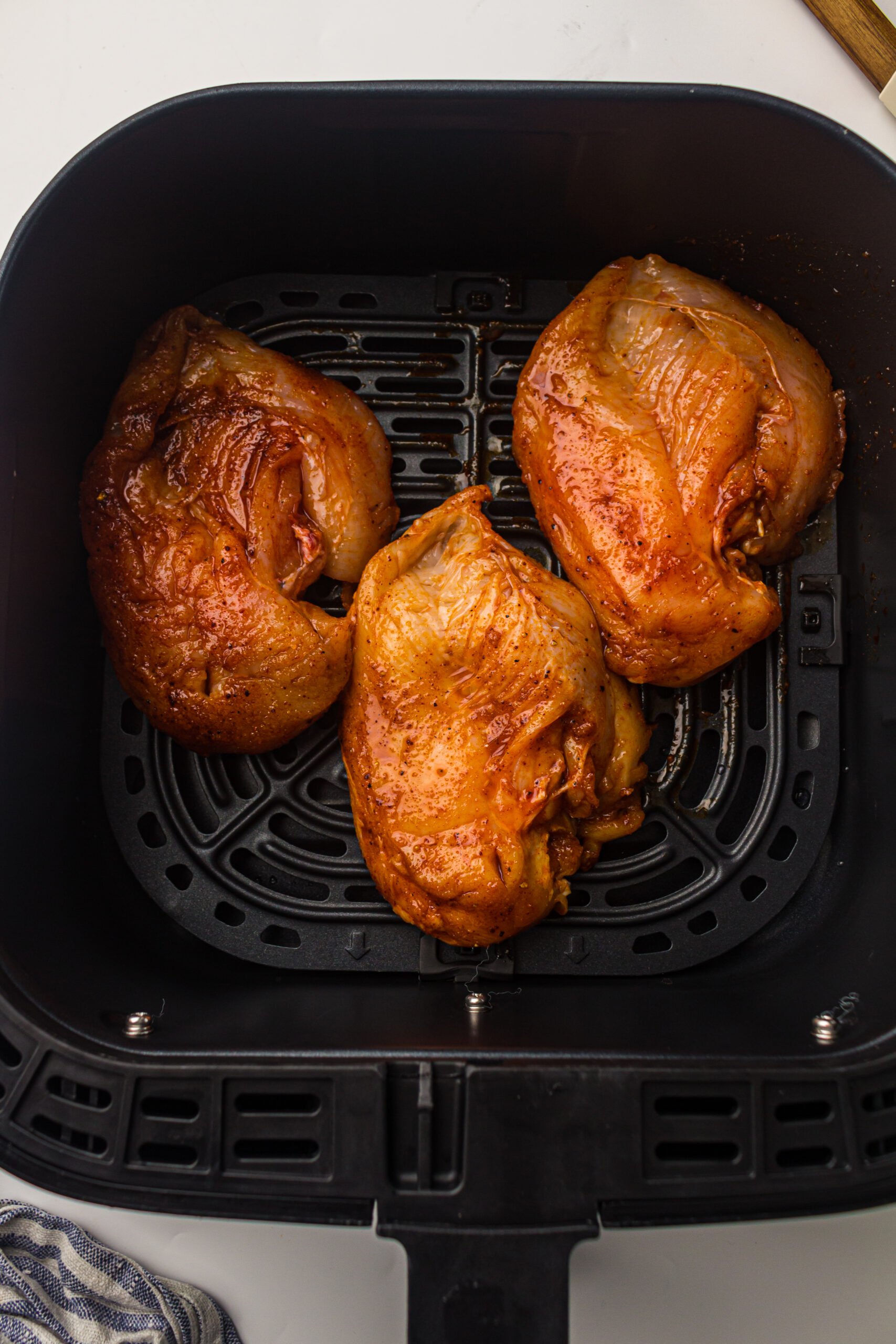 - After marinating, remove the chicken breasts from the marinade and place them in the air fryer basket in a single layer (rounded side down).